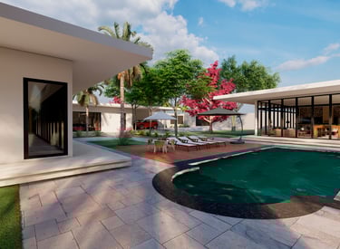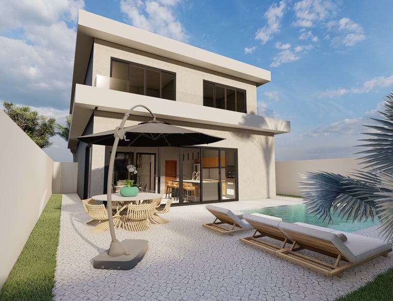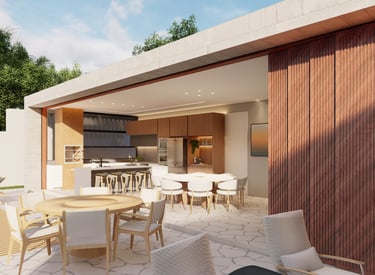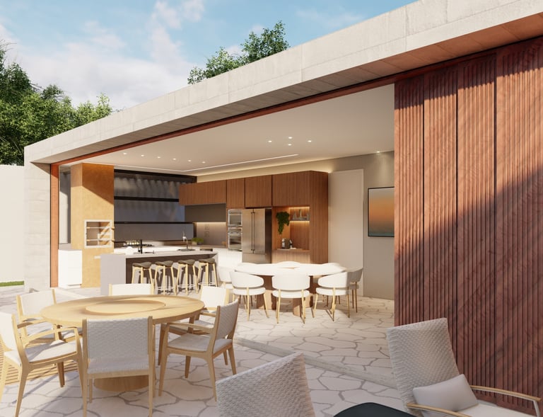 A coastal villa where indoor and outdoor spaces flow seamlessly. White-rendered walls and timber screens filter Mediterranean sunlight throughout the day.